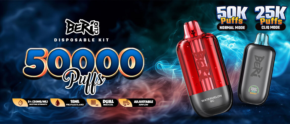 The BERI CLIQ 50K Disposable Kit is the perfect combination of stylish design and high functionality. The most attractive feature of the kit is the clear glass tank, giving a crystal-like effect. Available in Blue Razz Ice, Miami Mint, Super Mint, Peach Ice, and more flavors, the BERI CLIQ vape is powered by a good capacity battery, and you would be quite amazed by the quality of the device, both in looks and performance. The BERI CLIQ vape has great quality and features that are listed below: