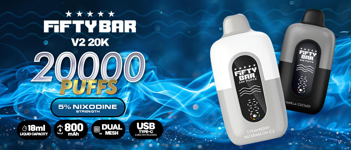 Presenting the Fifty Bar 20K Nixodine Disposable vape, which delivers approximately 20,000 puffs from its massive 18ml liquid capacity. This high-puff disposable vape features a rechargeable battery via USB Type-C, adjustable airflow for personalized draws, and AA boost mode for consistent power. Constructed for durability, the Fifty Bar 20K puf vape provides a vape-while-charging feature and top-notch anti-burn technology, all packed in a beautiful, ergonomic design. Here are the best features of the Fifty Bar vape: